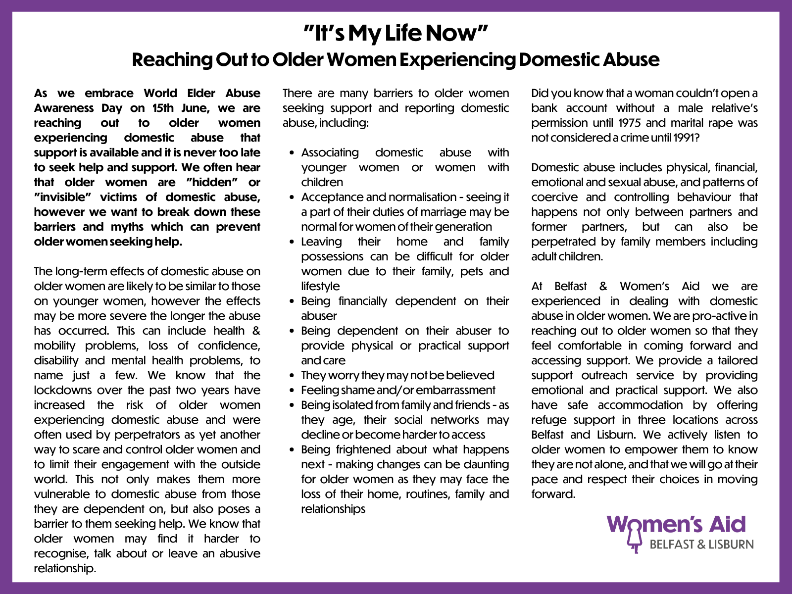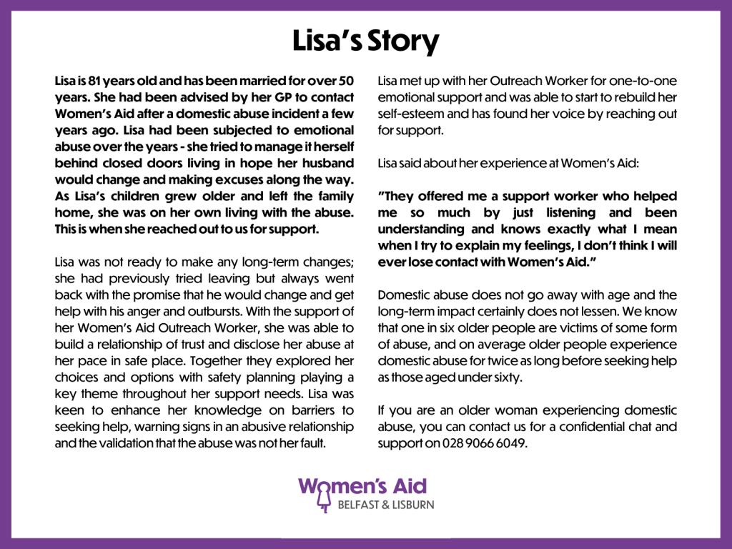 Today, on #WEAAD22, we want to share Women’s Aid Belfast & Lisburn’s message that that support is available for victims of domestic abuse of any age and highlight that it’s never too late to seek help. We have shared below a wonderful article from Women’s Aid Belfast & Lisburn along with ‘Lisa’s Story’.